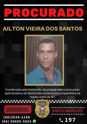 Ailton Vieira dos Santos esfaqueou a ex-mulher dele, em Nova Guarita, a 667 km de Cuiabá, e está foragido da Polícia Civil. Segundo a polícia, ele foi condenado a 18 anos de prisão pelo assassinato que da própria mãe, em 2014.
